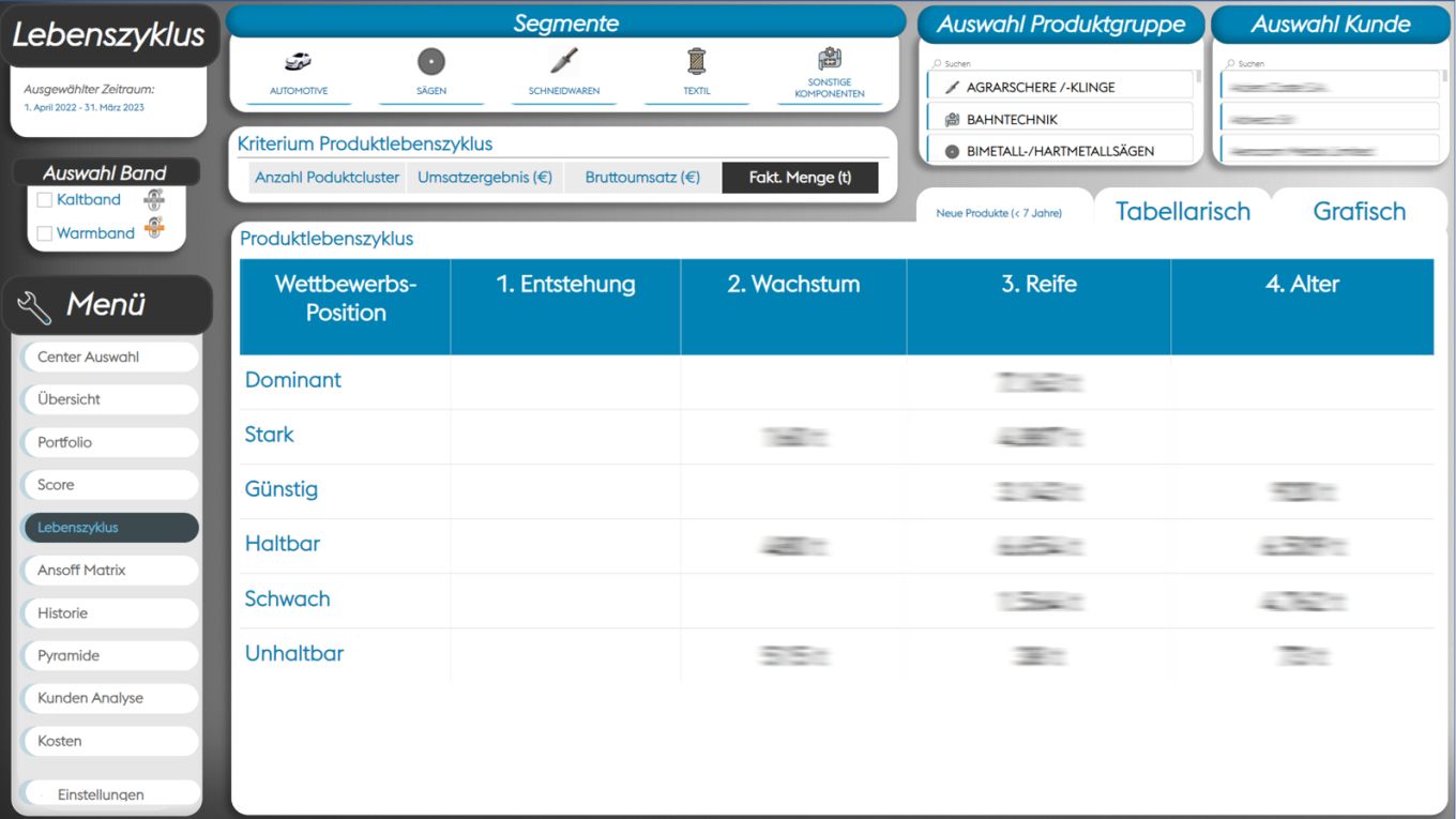 Am Standort eines Stahlherstellers war das Produktportfolio über die Jahre zu einem undurchsichtigen Gebilde mit rund 10000 Artikeln gewachsen. Zusammenhänge zwischen Produkten, Kunden, Märkten und dem eigenen Unternehmen waren weder darstellbar noch erklärbar. Dies hatte zur Folge, dass insbesondere strategische Diskussionen überwiegend emotional geführt wurden. Deshalb wurde beschlossen ein Werkzeug für Vertrieb und Management zu entwickeln, was Transparenz im Produktportfolio schaffen sollte, um faktenbasierte Entscheidungen zu ermöglichen.